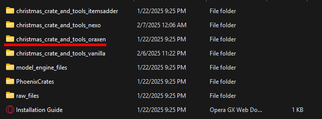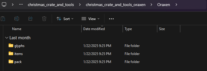 Open the **christmas\_crate\_and\_tools\_oraxen** folder. Inside, you will find the glyphs, items and pack folders.