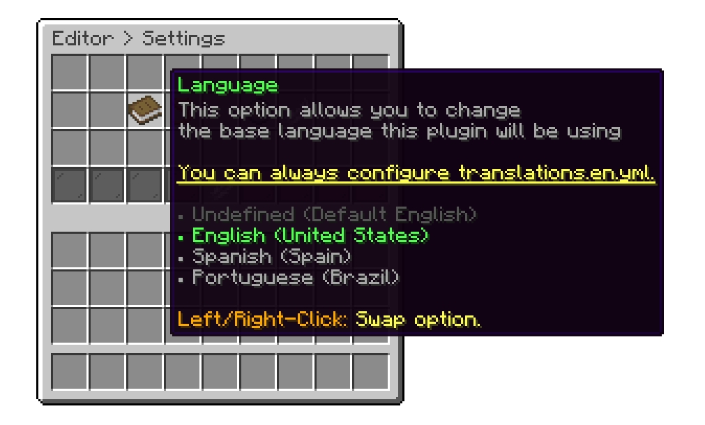 All texts that the player can see are customized in the configuration file for example holograms, chat messages, and menus.