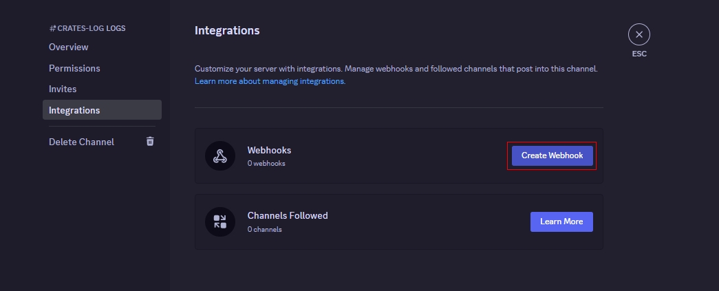 First, go to the settings of the Discord channel where you want to log crate actions. Then, navigate to the Integrations tab and click Create Webhook.