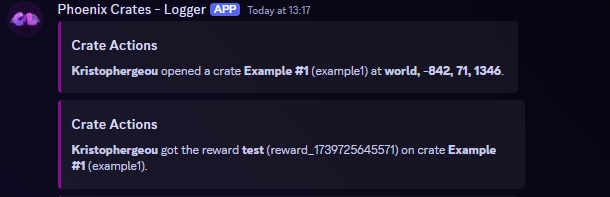 With the logger, you can send a webhook to a specific channel whenever a user opens a crate or receives a specific reward from a designated crate.