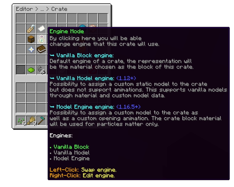 This is the default engine for a crate, and it's the simplest option. With this engine, you can select a specific block to act as your crate block.