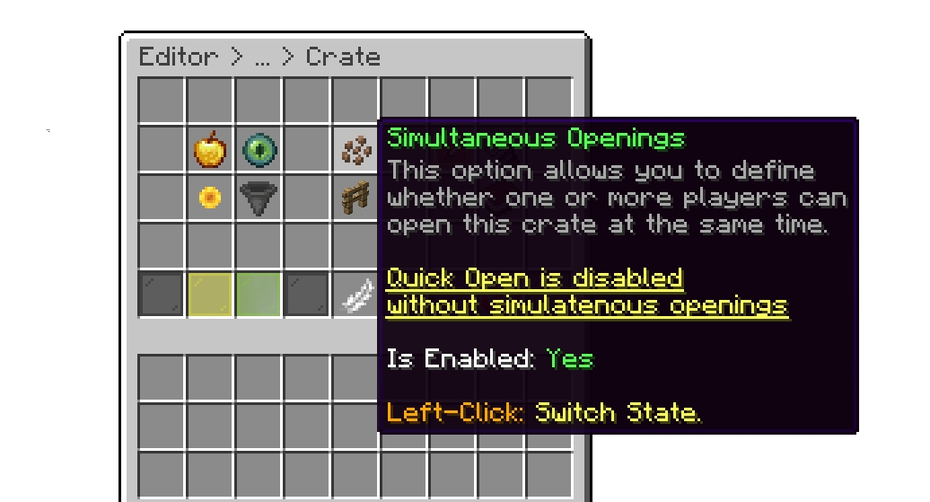 With this option, multiple users can open the crate simultaneously. When enabled, only the user opening the crate will see the opening animation. When disabled, everyone nearby will see the crate opening animation. By default, this option is enabled.