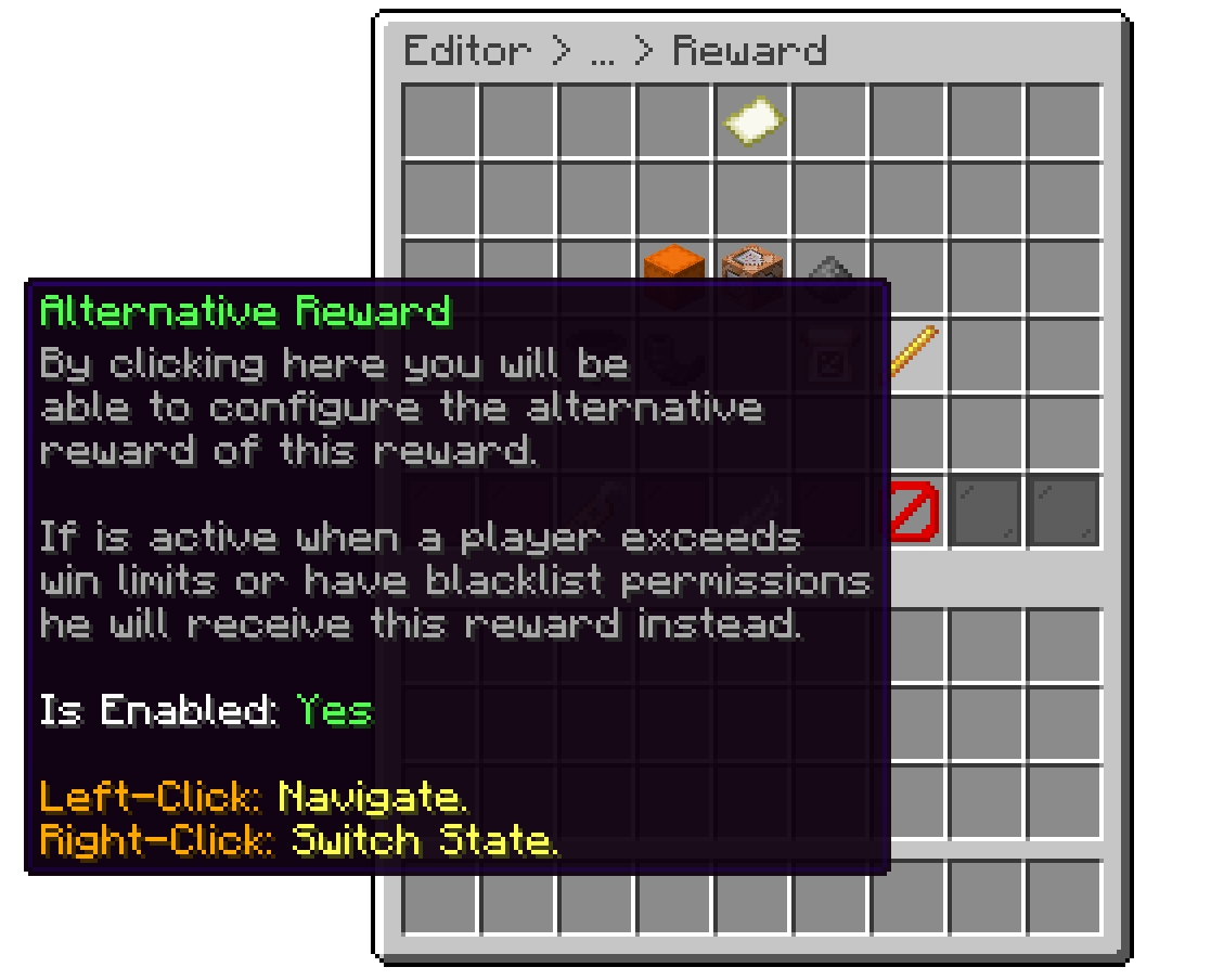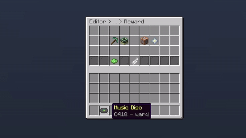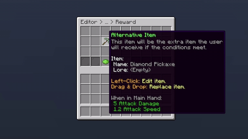 In the editor, you can drag and drop the item you want to assign as a reward. Alternatively, you can edit its display name and lore by left-clicking on the item.